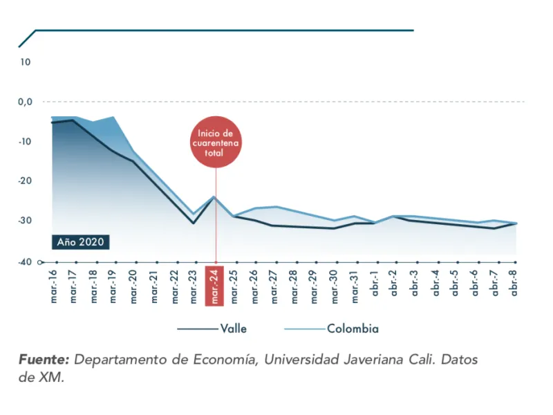 Asimismo, señala los municipios con mayores contracciones en la demanda de energía no regulada en el Valle fueron Yumbo, Zarzal y Calima, con reducciones de alrededor de 50 % frente a la semana base. Los municipios de Cali y Jamundí presentan reducciones de 21,6% y 24,6%.